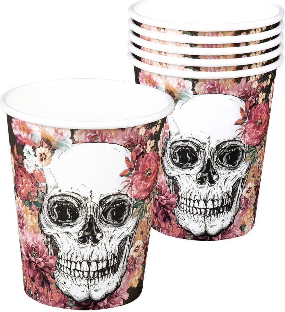 Deze kartonnen bekers worden verkocht per set van 6. Ze hebben een inhoud tot 25 cl drank. De bekers zijn zwart met een opdruk van een skelet en bloemen. De bekers zullen onmisbaar zijn om een chique Halloweentafel mee af te maken!