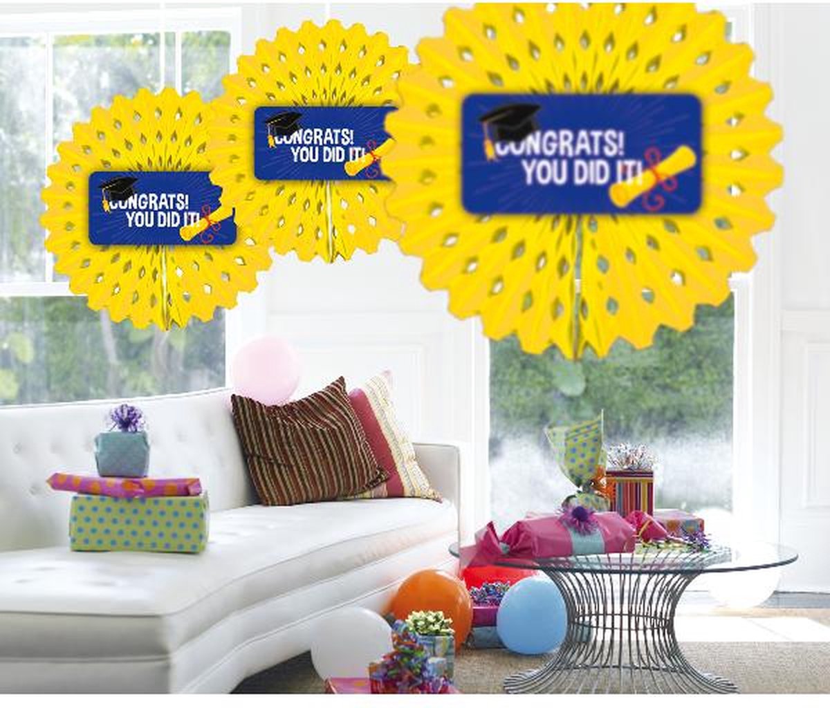 Heeft er iemand diens diploma gehaald? Maak dat geslaagd feestje dan helemaal af met deze honeycomb fan in een gele kleur. In het midden staat de tekst "Congrats! You did it!" met een afstudeerhoed op een blauwe achtergrond.