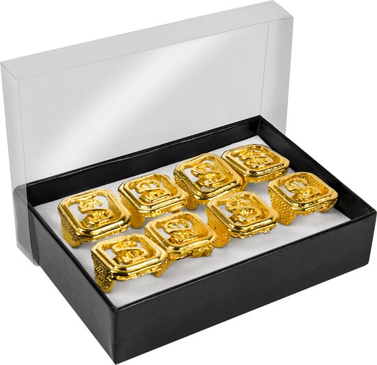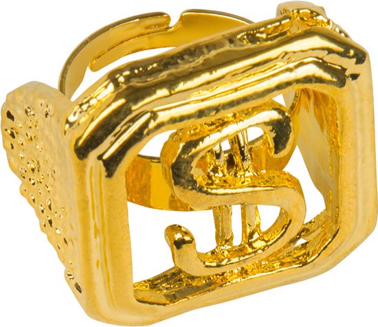 set 8 ringen dollar zijn ringen met een dollar teken erop dat is gemaakt van ijzer. Het valt erg op omdat er een grote dollar sign op zit en is dan ook leuk om te dragen. naar feestjes of naar bling bling. neem 8 goudkleurige dollar ringen mee naar waar je ook maar wilt.