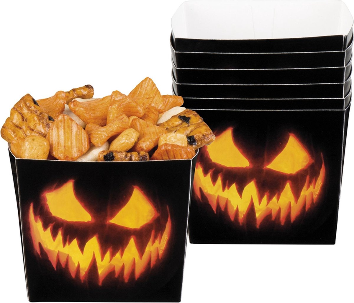 Deze set bestaat uit 6 pompoen bakjes van karton met een inhoud van 40 cl. De kleine zwarte bakjes hebben een opdruk van een duivelse pompoen. Ga voor een complete pompoen decoratie tijdens Halloween met deze bakjes!