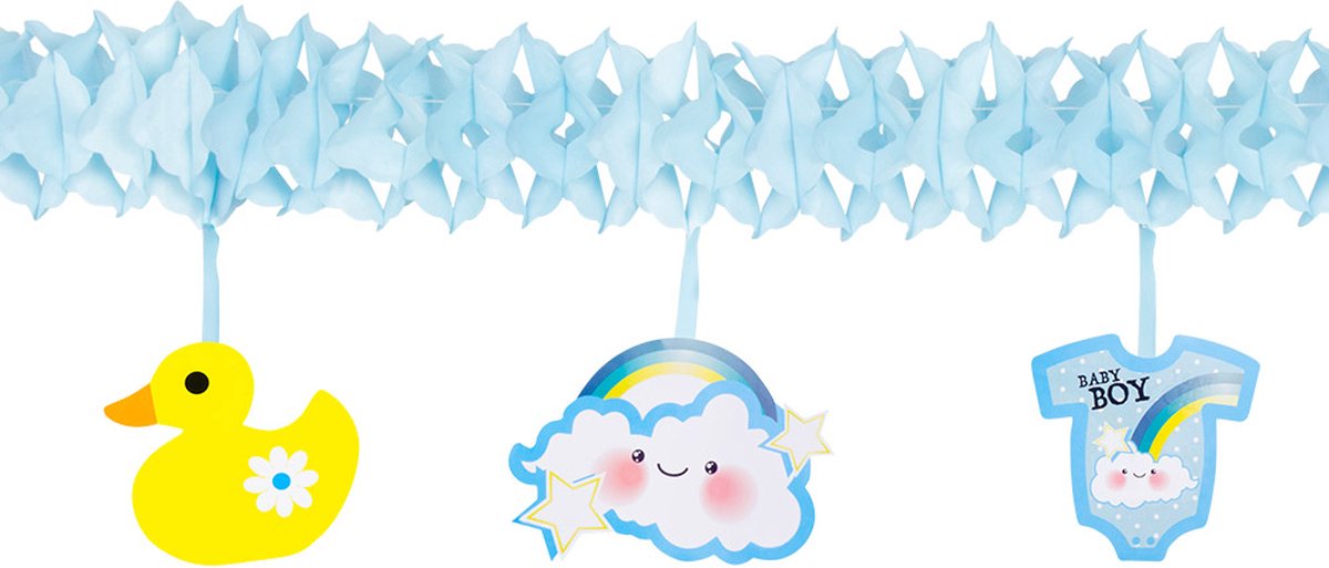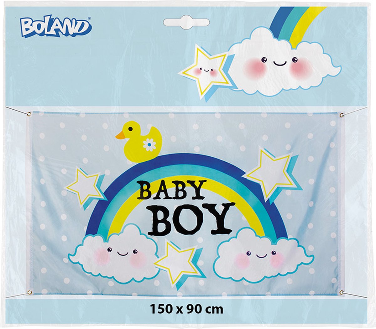 Een leuke geboorte versieringspakket voor baby boy, Met een grote vlag van 150x90cm, een letterslinger, Vlaggenlijn, hangdecoratie en servetten. Dat is leuk om een geboorte feest aan te kleden of voor de baby shower. Dus een mooi gevuld versieringspakket